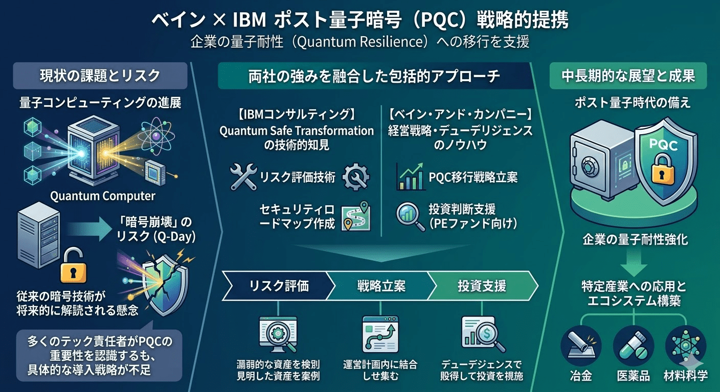 今回の提携では、IBMコンサルティングが保有する「Quantum Safe Transformation(量子セーフ変革)」の技術的知見と、ベインが得意とする経営戦略・デューデリジェンスのノウハウを統合します。