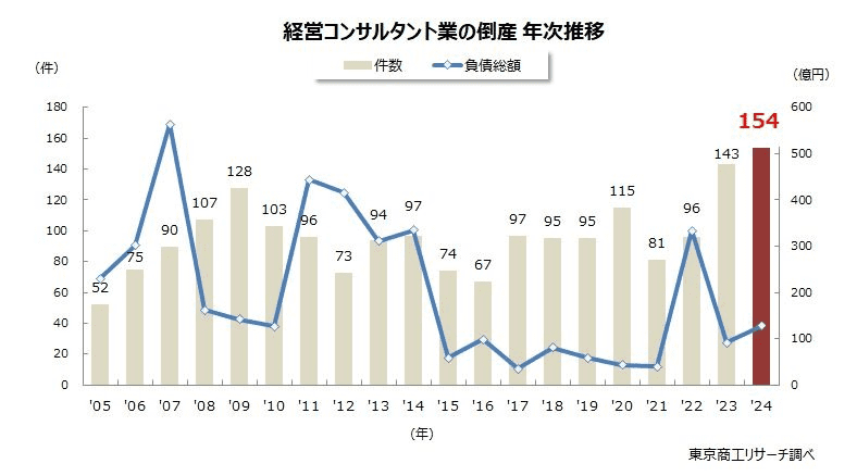 2024年の「経営コンサルタント業」の倒産件数が、154件(前年比7.6%増)に達し、集計開始以降で過去最多を更新したことが明らかになりました。
